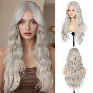 Perruque longue ondulée grise avec frange rideau pour femme, 66 cm (26 pouces), gris argenté, en fibres synthétiques résistantes à la chaleur, aspect naturel, idéale pour le quotidien, les fêtes et le