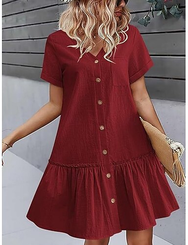 Femmes Mini Robe Faux coton lin Robe trapèze Occasionnel Quotidien Coupe Ample Uni Manche Courte Col en V Bleu Blanche Vin Vert Véronèse Été Printemps