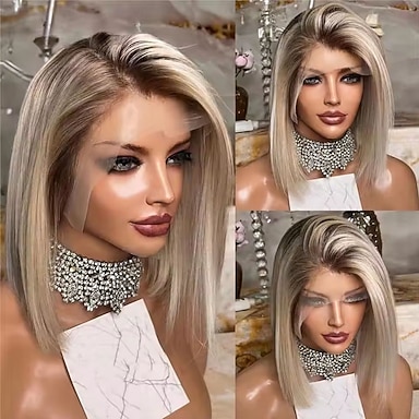 Perruque courte en cheveux humains, coupe au carré, raie libre, blond cendré ombré, avec closure 5x5 et lace front 13x4. Cheveux brésiliens lisses, raie au milieu, avec baby hair et ligne de cheveux