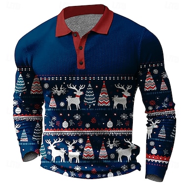 Noël Homme Cerf Chemises Polo Gaufre manche longue Polos Col Drôle Vacances Tenue de soirée Tenue Quotidienne Impression 3D Boutons Printemps Automne Hiver Bleu