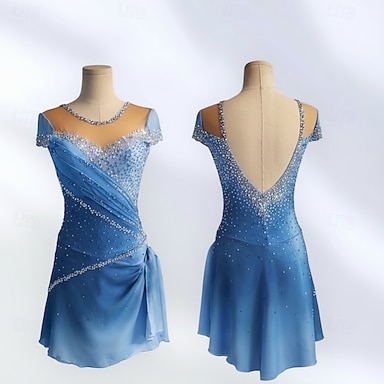 Robe de patinage artistique Femmes Patinage Robe Bleu Ciel Patchwork Dos Nu Élastique Entraînement Compétition Tenue de Patinage Classique cristal pailleté Manche Courte Patinage sur glace Patinage