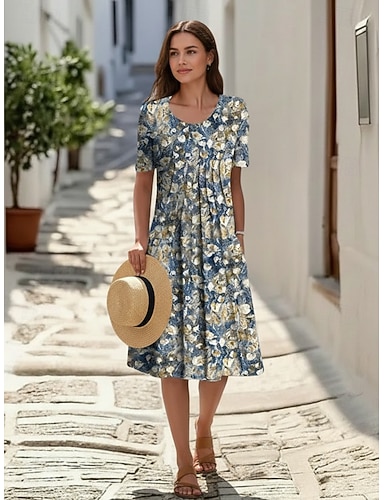 Femmes Robe Longueur Genou Robe Décontractée Robe Fleurie Robe d'été Élégant Mode Moderne Extérieur Vacances Sortir Coupe régulière Fleuri Manche Courte Col en V Bleu Blanche Jaune Grise Été Printemps