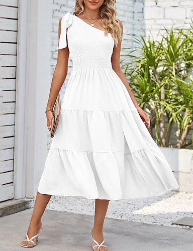 Femmes Robe Midi Faux coton lin Robe fourreau Robe d'Été Robe Blanche Mode Moderne Extérieur Vacances Anniversaire Coupe régulière Uni Sans manches Une Épaule Bleu Rose Claire Noir Blanche Été
