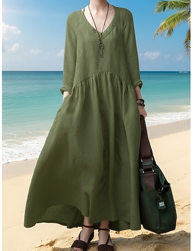 Femmes Robe maxi Faux coton lin Robe Caftan Robe Décontractée Robe en Coton Basique Classique Occasionnel Quotidien Extérieur Vacances Coupe Ample Uni manche longue Col en V Vert militaire Noir