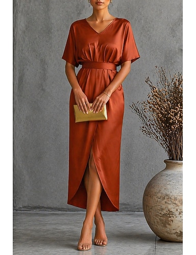 Femmes Robe Midi Robe en Satin Robe de Soirée Robe de Cocktail Élégant Moderne Soirée Coupe régulière Uni Manche Courte Col en V Noir Jaune Bleu Roi Vert foncé Printemps Automne Hiver