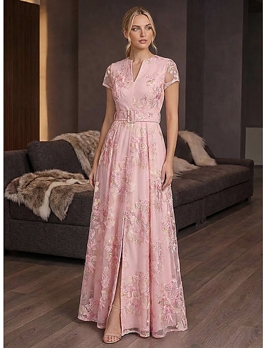 Robe invitée de mariage longueur de sol A-Line Robes formelles robe de soirée Robe mère de la mariée manches courtes col en V élégante vintage fête avec broderie