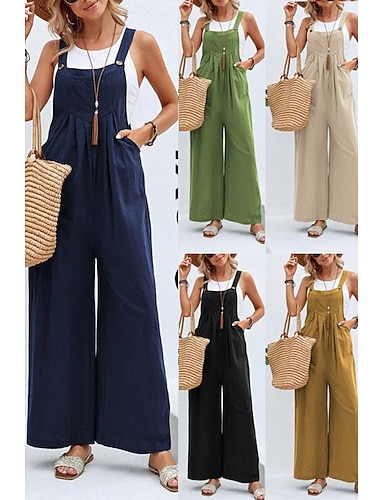 Combinaison sans manches pour femme, couleur unie, jambes larges, col carré, poches, boutons, vacances, quotidien, coupe ample, noir, jaune, rose, été