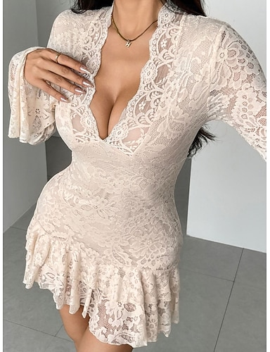 Ligne A Longueur thé Robe de Soirée Robe de Cocktail Robe d'invité de mariage Robe de Mère de Mariée manche longue Col en V Élégant ancien Fête Formel Fête Cocktail avec Dentelle