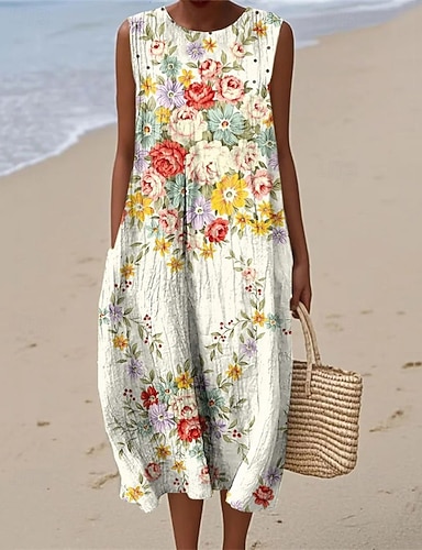 Femmes Robe Midi Robe Décontractée Robe d'été Mode Moderne Quotidien Plage Week-end Coupe régulière Fleur Sans manches Col ras du cou Blanche Jaune Automne