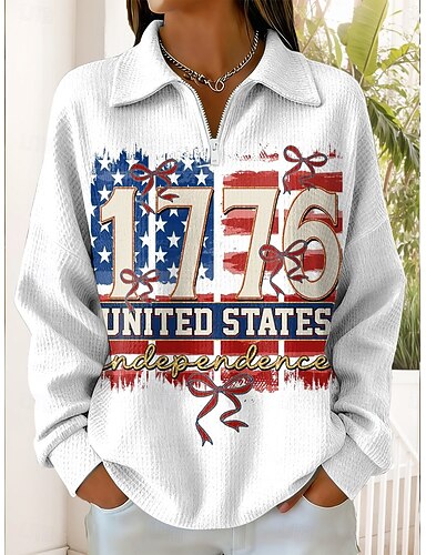 Jour de l'indépendance Anniversaire américain Patriote Sweatshirt pour femmes Graphique Décontracté Imprimé Manches longues Demi-zip Hauts réguliers Vêtements décontractés Quotidien Sports Noir Blanc