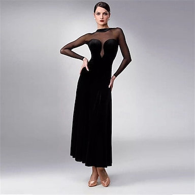 Robe de danse de salon pour femme, en velours, maille, manches longues, valse, tango, compétition latine, robe de performance élégante, noire