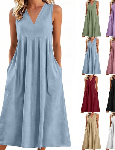 Femmes Robe maxi Faux coton lin Robe Décontractée Robe en Coton Robe débardeur Élégant Mode Moderne Extérieur Vacances Sortir Coupe Ample Uni Sans manches Col en V Bleu Rose Claire Kaki Gris Ét