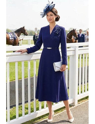 Robe de fête longueur thé en A robe de cocktail robe de invitée de mariage robe de mère de la mariée à manches longues décolleté col drapé élégante formelle invitée de mariage avec des boutons