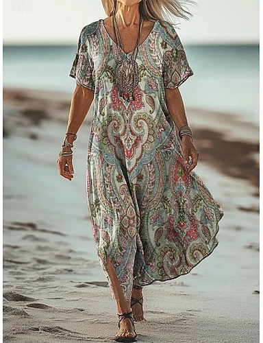 Femmes Robe maxi Robe d'Été Robe T-Shirt Robe trapèze Vacances Occasionnel Plage Sortir Coupe régulière Graphique Tribal Manche Courte Col en V Rouge Orange Beige Été Printemps