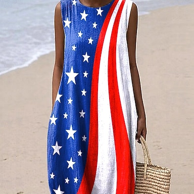 Jour de l'Indépendance Américaine Femmes Robe Midi Robe fourreau Robe d'Été Vacances Occasionnel Extérieur Coupe Ample Étoiles et rayures Sans manches Col Rond Bleu et blanc Bleu Océan Rouge / Bleu