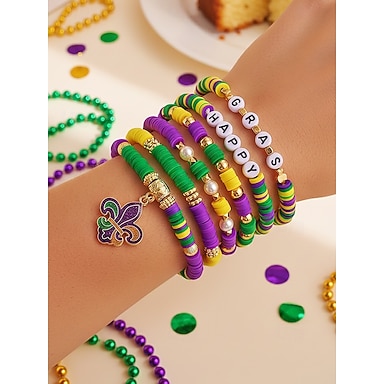 Ensemble de bracelets en acrylique pour femmes, design à motifs variés, thème Mardi gras, parfait pour le carnaval et les festivités.