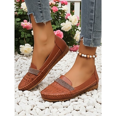 Chaussures mocassins décontractées en camel pour femmes – Mocassins slip-on en faux cuir avec sangle en strass parfaits pour un port quotidien confortable la marche le bureau la conduite et les