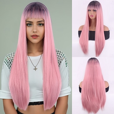 Perruque longue et lisse rose ombré avec frange, en cheveux synthétiques résistants à la chaleur, pour femme, look naturel, cosplay d'Halloween