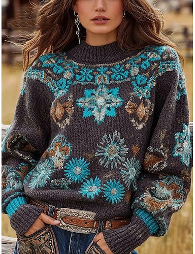 Femmes Pull Quotidien Occasionnel Fleuri Graphique Côtelé Col ras du cou Tricoté Imprimé manche longue Hauts Réguliers Tricoter Extérieur Week-end Gris foncé Automne Hiver