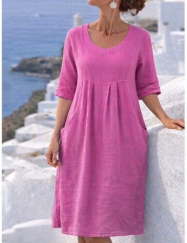 Femmes Robe Midi Robe fourreau Robes en coton et lin Robe Décontractée Robe d'été en coton Basique Moderne Quotidien Week-end Coupe Ample Uni Manche 3/4 Col ras du cou Blanche Rose Claire Ét