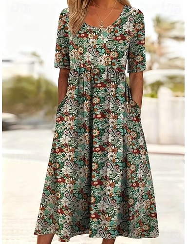 Femmes Robe Midi Robe fourreau Vacances Occasionnel Boho Quotidien Robe d'Été Robe de Printemps Coupe régulière Fleuri Graphique Manche 3/4 Col ras du cou Vert Claire Rose Claire Vert foncé Ét