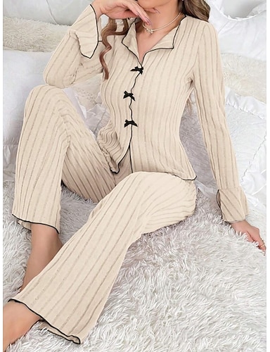 Femmes Ensemble Pyjama Occasionnel Confort Couleur Unie Taille Élastique Pantalon Quotidien Maison manche longue Revers Noir Rose Claire Beige Gris Été Printemps Automne Coupe régulière