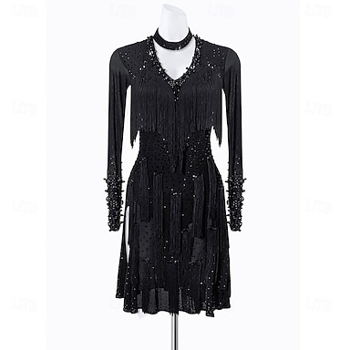 Robe de danse latine noire à franges et perles pour femme - costume de bal asymétrique à manches longues et col ras du cou
