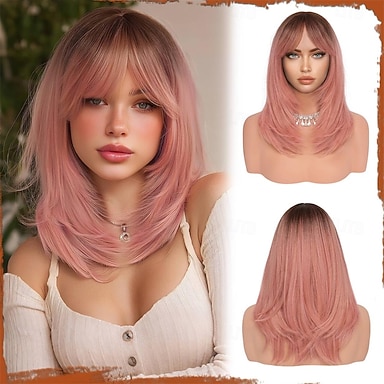 Perruque rose longue, lisse et dégradée avec frange, 40 cm (16 pouces), racines foncées, aspect naturel, cheveux synthétiques doux et résistants à la chaleur, longueur mi-longue, idéale pour une