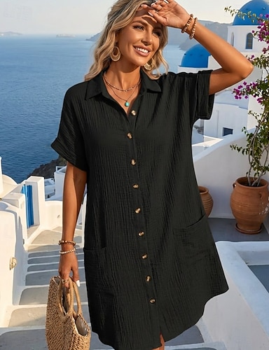 Femmes Mini Robe Robe Chemise Classique Moderne Extérieur Vacances Coupe régulière Uni Manche Courte Col de chemise Bleu Noir Blanche Rose Claire Été