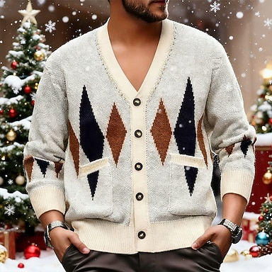 Homme Chandails de Noël pull de Noël Gilet Cardigan Pull Court Pull Tricoté Côtelé Tricoter Hauts Réguliers Boutonner Avec Poches Géométrique Col en V Mode Classique Vacances Tenue quotidienne