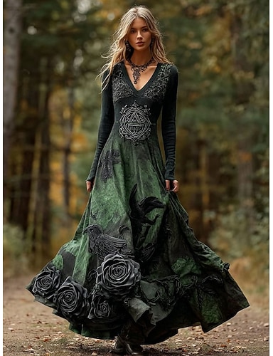 Robe maxi femme Robe A-line Robe plissée Robe évasée Robe boho Date Coupe régulière Graphique floral Manches longues Col en V Vert Printemps Automne Hiver