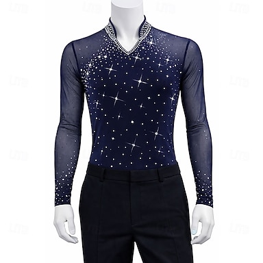 Haut de Patinage Artistique Homme Patinage Hauts Bleu marine Patchwork Élastique Entraînement Compétition Tenue de Patinage Classique cristal pailleté manche longue Patinage sur glace Patinage