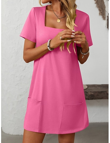 Femmes Mini Robe Faux coton lin Robe fourreau Robe Décontractée Robe d'été Élégant Mode Moderne Extérieur Vacances Sortir Coupe régulière Uni Manche Courte Col carré Noir Rose Claire Vert Gris Clair