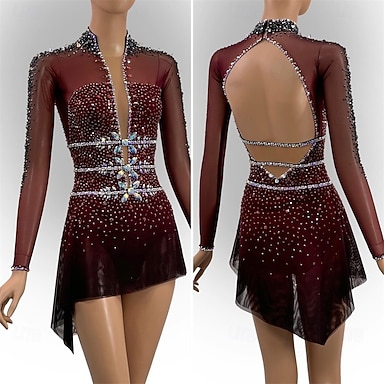 Robe de Patinage Artistique Femme Fille Patinage Robes Rouge Bordeaux Patchwork Dos ouvert Maille Haute élasticité Entraînement Compétition Tenue de Patinage Classique Cristal / Stras manche longue