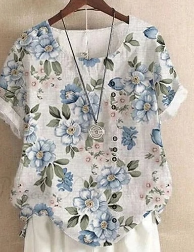 La Saint-Valentin Femmes Chemise Chemisier Faux coton lin Imprimé Fleuri Graphique ancien Élégant Occasionnel Manche Courte Col ras du cou Hauts Longs Quotidien Bleu clair Été Printemps