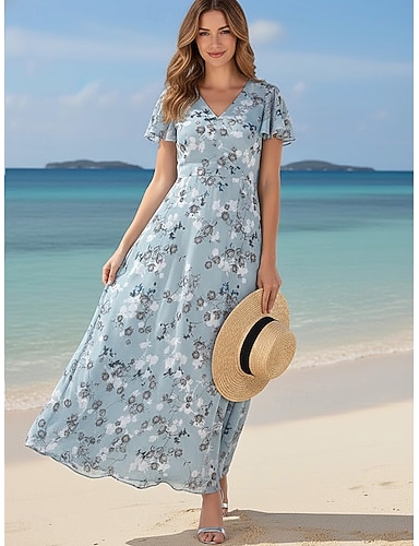 Femmes Robe maxi Robe trapèze Vacances Occasionnel Extérieur Sortir Coupe régulière Fleuri Graphique Manche Courte Col en V Bleu Ciel Été Printemps