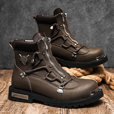 Bottes de combat marron en cuir synthétique véritable pour hommes avec boucles métalliques et fermeture éclair, bottes de travail de moto robustes pour les aventures en plein air et les vêtements de ville décontractés