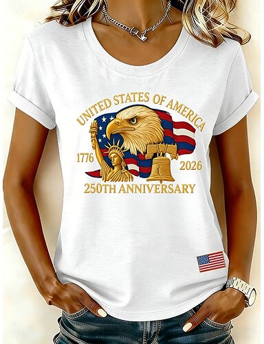 Jour de l'Indépendance Américaine Femmes T-shirt Imprimé Graphique Lettre Drapeau Américain Élégant Classique Occasionnel Manche Courte Col ras du cou Hauts Réguliers Quotidien Bleu Frêne Noir Blanche
