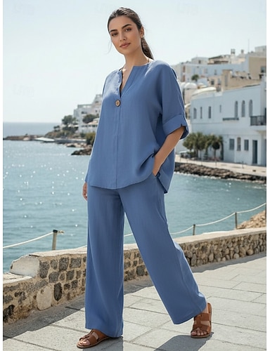 Femmes Ensembles de Pantalons Faux coton lin Manche Courte Col ras du cou Uni Mode Streetwear Occasionnel Quotidien Extérieur Bleu Noir Blanche Été Coupe Ample