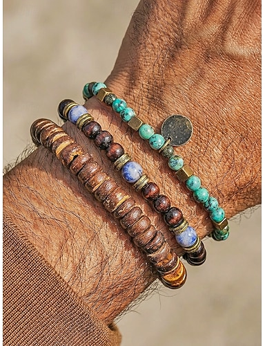 Ensemble de 3 bracelets bohèmes pour homme, en coquillage de noix de coco, turquoise et perles de bois. Ces bracelets extensibles et empilables sont parfaits pour les vacances à la plage, les tenues d'été décontractées et le quotidien.