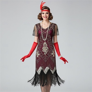 Set Années Folles Années 1920 Mi-long Court Robe Robe Charleston Tenues avec accessoires Sans manches Gatsby le Magnifique Invité au mariage Paillettes Frange à pompons Paillettes Col en V Déguisement