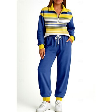 Femmes Sweat-shirt Ensemble Survetement Survêtement 2 pièces Cordon de serrage Zip Up Rayé Ensemble Vêtements Printemps Automne Hiver Bleu Métier Extérieur Voyage Léger Mode manche longue Sport