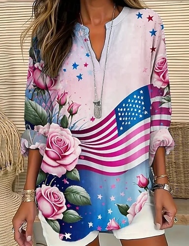 Jour de l'Indépendance Américaine Femmes T-shirt Imprimé Graphique Drapeau Américain ancien Élégant Classique manche longue Col en V Hauts Longs Quotidien Week-end Bleu Rose Claire Rouge Vert Ét