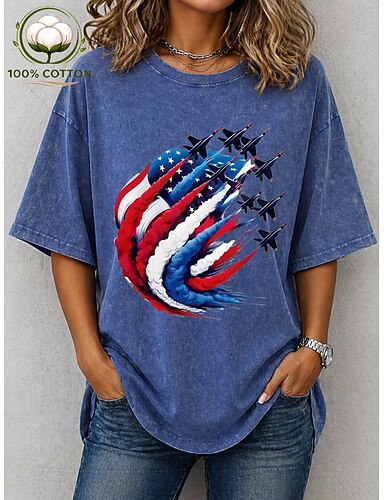 Jour de l'Indépendance américaine chemise femme 100% coton impression graphique drapeau stylé basique classique à manches courtes col rond hauts longs décontractés quotidien bleu rose violet clair