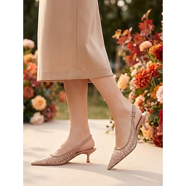 Escarpins nude à strass, talon chaton et bride arrière, bout pointu, élégants, parfaits pour une invitée à un mariage ou une cérémonie en plein air. &événements formels