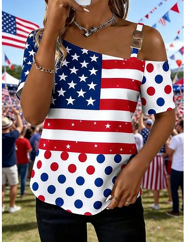 Jour de l'Indépendance Américaine Femmes T-shirt Imprimé Graphique Drapeau Américain Mode Élégant Classique Manche Courte Une Épaule Hauts Réguliers Quotidien Sortir Week-end Rouge Été Printemps