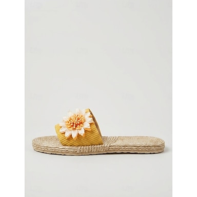 Sandales plates et confortables pour femmes, en corde tressée jaune à motif floral, ornées de tournesols, idéales pour les vacances d'été et les escapades insulaires. &vêtements de plage décontractés