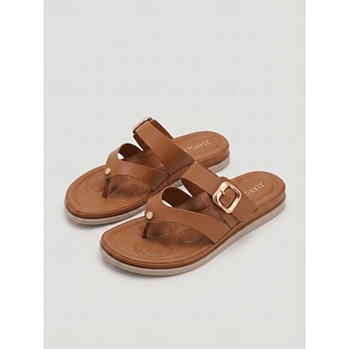 Sandales à lanières marron pour femme avec boucle réglable – mules confortables et rembourrées, ballerines d'été respirantes à bout ouvert, idéales pour la plage, les vacances et les voyages.