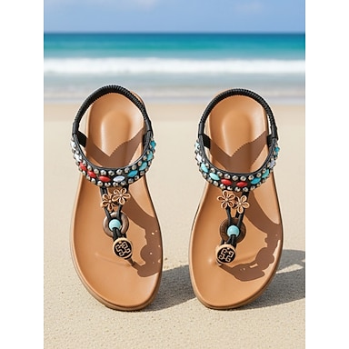 Sandales bohèmes noires pour femmes - chaussures de marche ethniques à bride en T ornées de perles et dotées d'une bride arrière élastique confortable, idéales pour les vacances en plein air et les
