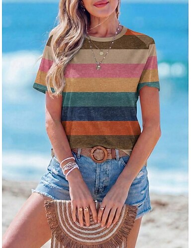Femmes T-shirt Imprimé Rayé Graphique Géométrique ancien Élégant Classique Manche Courte Col ras du cou Col rond Hauts Réguliers Occasionnel Quotidien Bleu Rose Claire Chameau Été Printemps